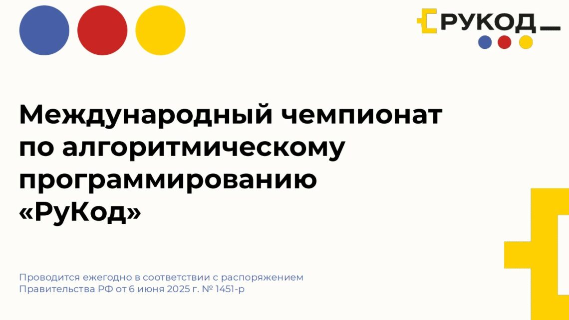 Ежегодно при координации Минцифры России будет проводиться Международный чемпионат по алгоритмическому программированию «РуКод» (далее – Чемпионат). Оператором Чемпионата выступит ФГАОУ ВО «Московский физико-технический институт (национальный исследовательский университет)» (далее – МФТИ).