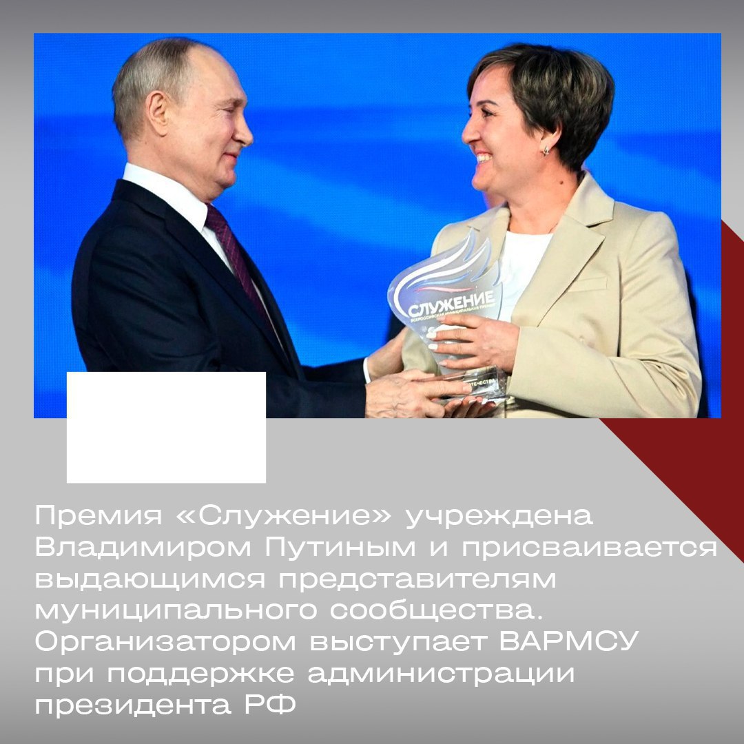 Премия «Служение» учреждена президентом РФ Владимиром Путиным и присваивается выдающимся представителям муниципального сообщества. Организатором выступает ВАРМСУ при поддержке администрации президента РФ.