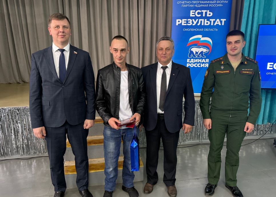 В завершение форума он совместно с Главой округа Виктором Титовым и депутатом областной Думы Николаем Дементьевым вручил награду – медаль Суворова – участнику СВО, уроженцу деревни Стегримово Монастырщинского округа Алексею Швалеву: боец получил её за личное мужество и отвагу, проявленные в бою.
